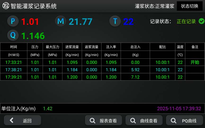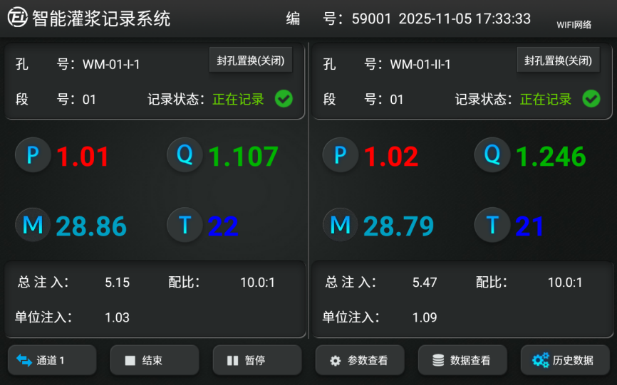 HG-VI型记录仪是一款一拖二化学灌浆记录仪,可以自动测量并记录两个通道的化学浆液重量。压力的测量:通过压力变送器(精度0.5%)测量压力。灌入浆液重量及体积的测量:通过高精度电子称(精度0.5%)直接测量浆液的质量,通过质量的变化得到注入率。记录仪可以实时显示两个通道的灌浆压力、注入率、灌入浆液质量、单位灌入量等参数并且自动记录和打印。